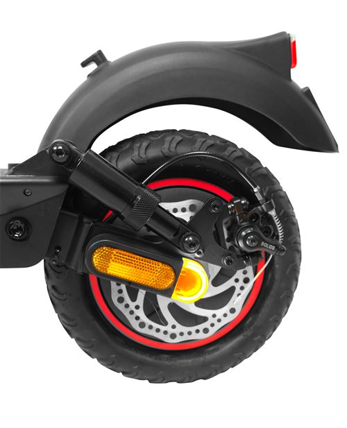 Le freinage est assuré par un frein à disque à l’arrière et un frein électronique à l’avant, garantissant une sécurité optimale, notamment lors des arrêts brusques. La trottinette intègre également un écran LED affichant la vitesse, l’autonomie restante et d’autres informations pratiques, offrant une bonne visibilité et un contrôle total pendant la conduite.